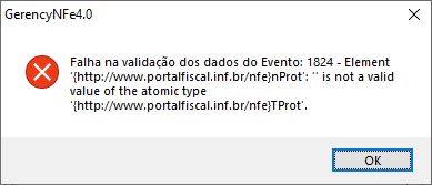 “Falha na validação dos dados do Evento: 1824 – Element ‘{http://www.portalfiscal.inf.br/nfe}nProt’: ” is not a valid value of the atomic type ‘{http://www.portalfiscal.inf.br/nfe}TProt’.”